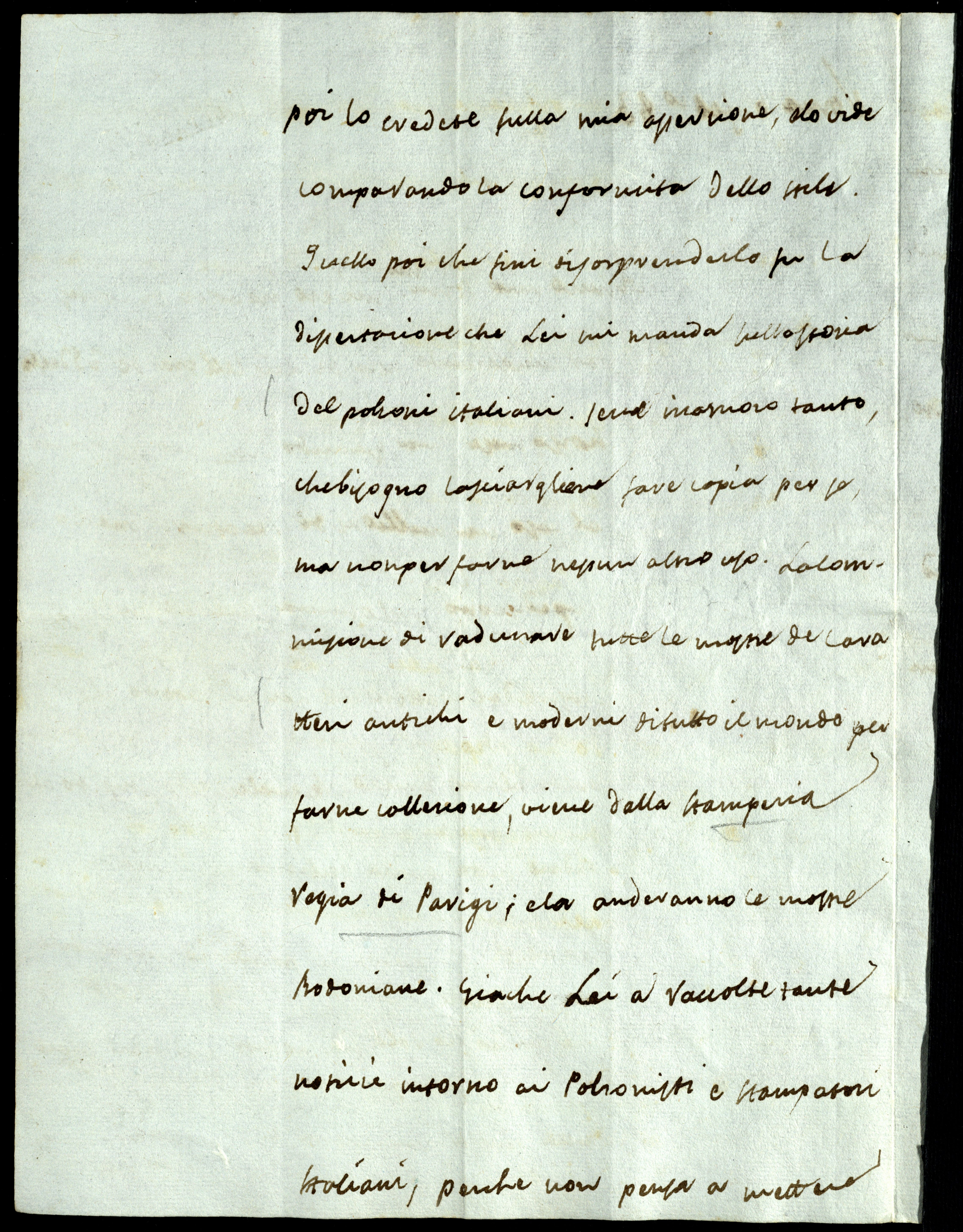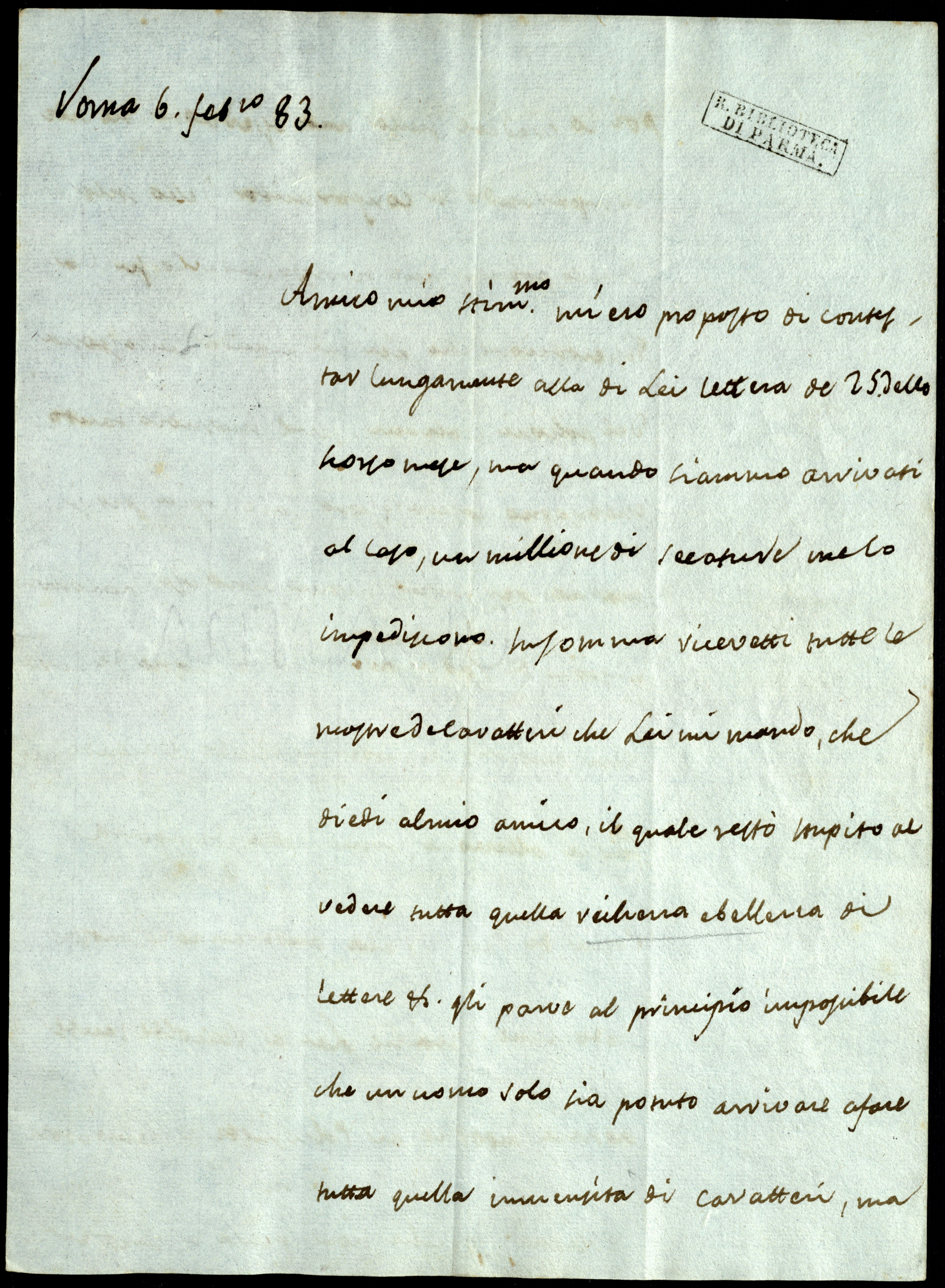 Insomma, ricevetti tutte le mostre de’ caratteri che Lei mi mandò, che diedi al mio amico, il quale restò stupito al vedere tutta quella richezza e bellezza di lettere, ecc. Gli parve al principio impossibile che un uomo solo sia potuto arrivare a fare tutta quella immensità di caratteri, ma poi lo credere sulla mia asserzione e lo vide comparando la conformità dello stile. Quello poi che finì di sorprenderlo fu la dissertazione che Lei mi manda sulla storia del [sic] polzoni italiani. Se ne inamorò tanto che bisognò lasciargliene fare copia per sé, ma non per farne nessun altro uso. La commisione di radunare tutte le mostre de’ caratteri antichi e moderni di tutto il mondo per farne collezione viene dalla Stamperia Regia di Parigi e là anderanno le mostre bodoniane. Giaché Lei ha raccolte tante notizie intorno ai polzonisti e stampatori italiani, perché non pensa a mettere in ordine le Sue idee per pubblicarle? Se io posso qualche cosa coi miei prieghi, lo scongiuro di farlo e di farlo presto. La materia è troppo curiosa.