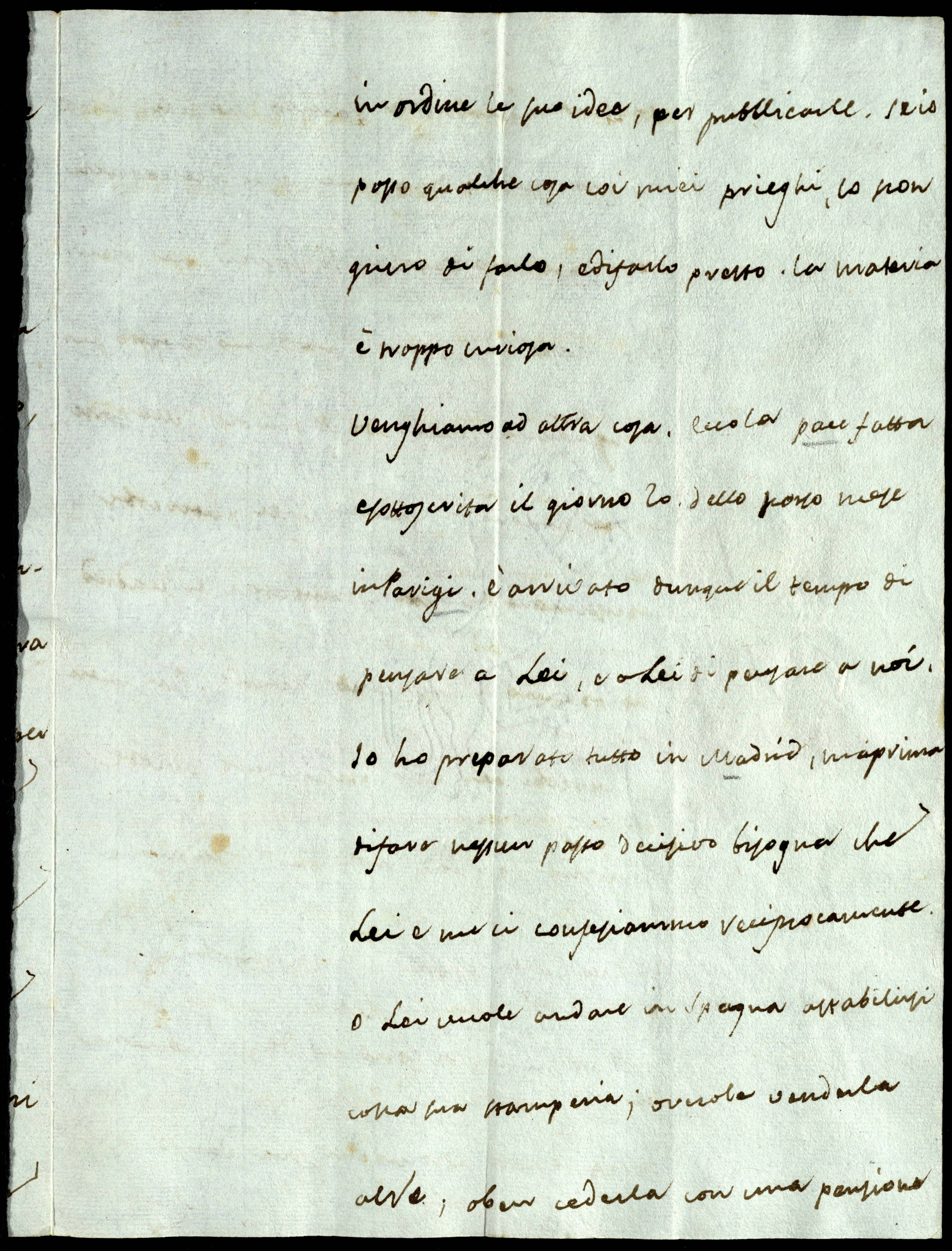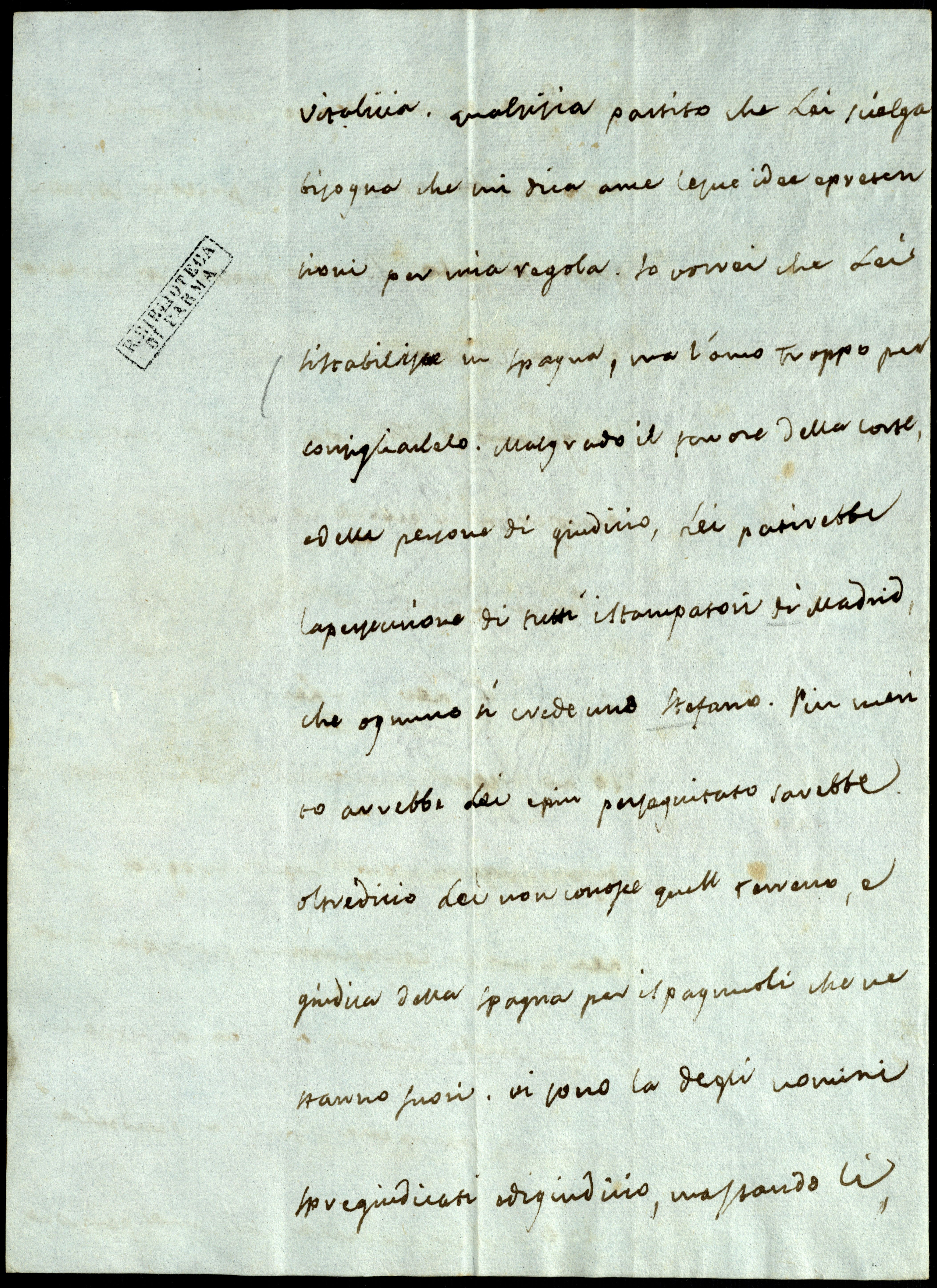 Venghiamo ad altra cosa. Ecco la paze [sic] fatta e sottoscrita il giorno 20 dello scorso mese in Parigi. È arrivato dunque il tempo di pensare a Lei e a Lei di pensare a noi. Io ho preparato tutto in Madrid, ma, prima di fare nessun passo decisivo, bisogna che Lei e me ci confesiammo reciprocamente: o Lei vuole andare in Spagna a stabilirsi colla Sua Stamperia, o vuole venderla al Re, o ben cederla con una pensione vitalicia. Qualsisia partito che Lei scielga, bisogna che mi dica a me le Sue idee e pretensioni per mia regola. Io vorrei che Lei si stabilisce in Spagna, ma L’amo troppo per consigliarlelo. Malgrado il favore della Corte e delle persone di giudizio, Lei patirebbe la persecuzione di tutti i stampatori di Madrid, che ognuno si crede uno Stefano. Più merito avrebbe Lei e più perseguitato sarebbe. Oltre di ciò, Lei non conosce quell terreno e giudica della Spagna per i spagnuoli che ne stanno fuori. Vi sono là degli uomini spregiudicati e di giudicio, ma, stando lì, gli bisogna stare ziti e mettersi all’unisono cogli altri. Siammo nella fine di un regno buono, ma la vechiaia è sempre debole, ecc.