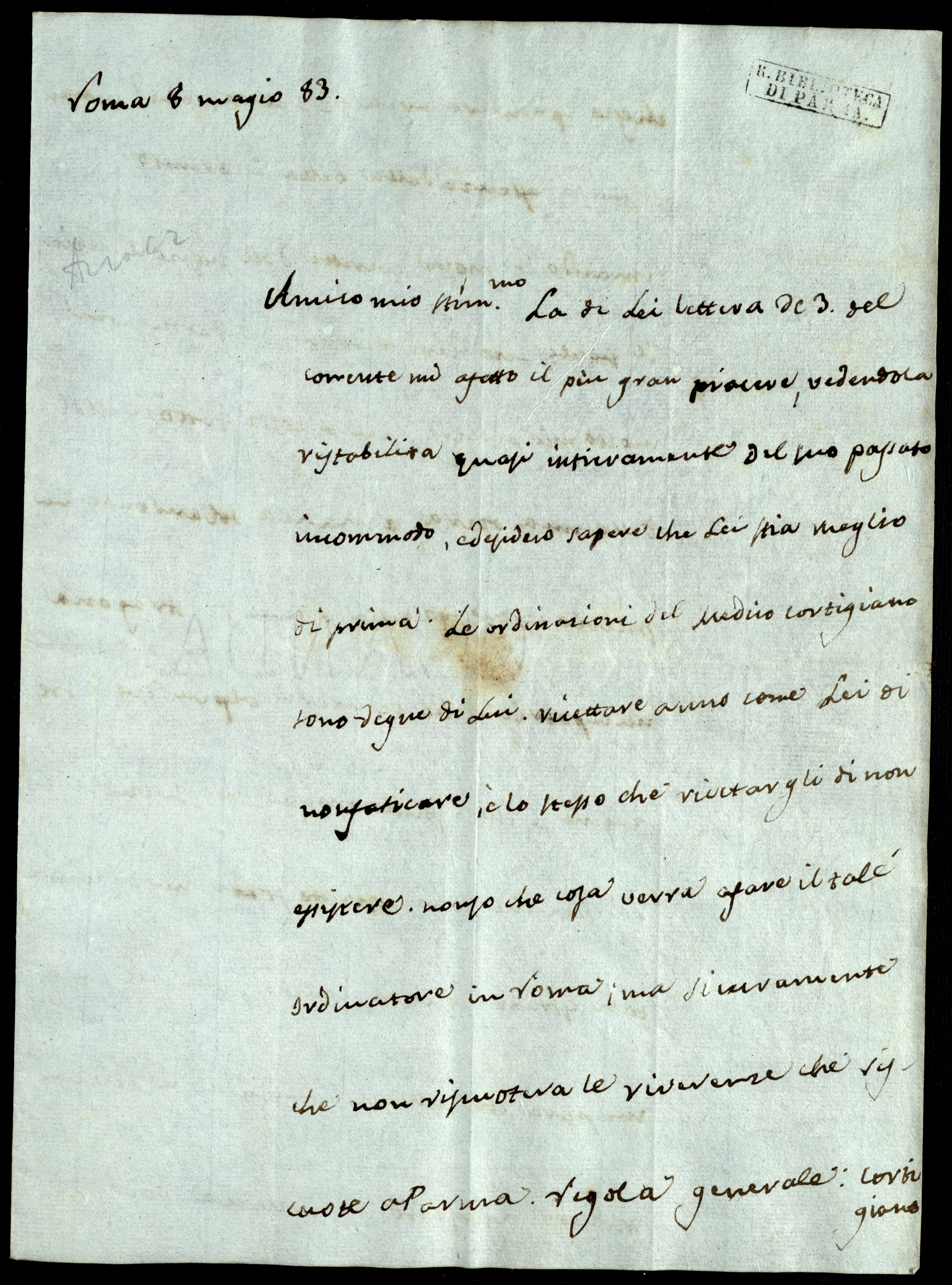 La di Lei lettera de 3 del corrente mi ha fatto il più gran piacere vedendoLa ristabilita quasi intieramente del Suo passato incommodo, e desidero sapere che Lei stia meglio di prima. Le ordinazioni del Medico cortigiano sono degne di lui. Ricettare a uno come Lei di non faticare è lo stesso che ricetargli di non essistere. Non so che cosa verrà a fare il tal ordinatorea in Roma, ma sicuramente che non riscuoterà le riverenze che riscuote a Parma. Regola generale: cortigiano ch’esce a prendere aria è fallito, come l’amante che fa assenza dalla bella è cornuto.