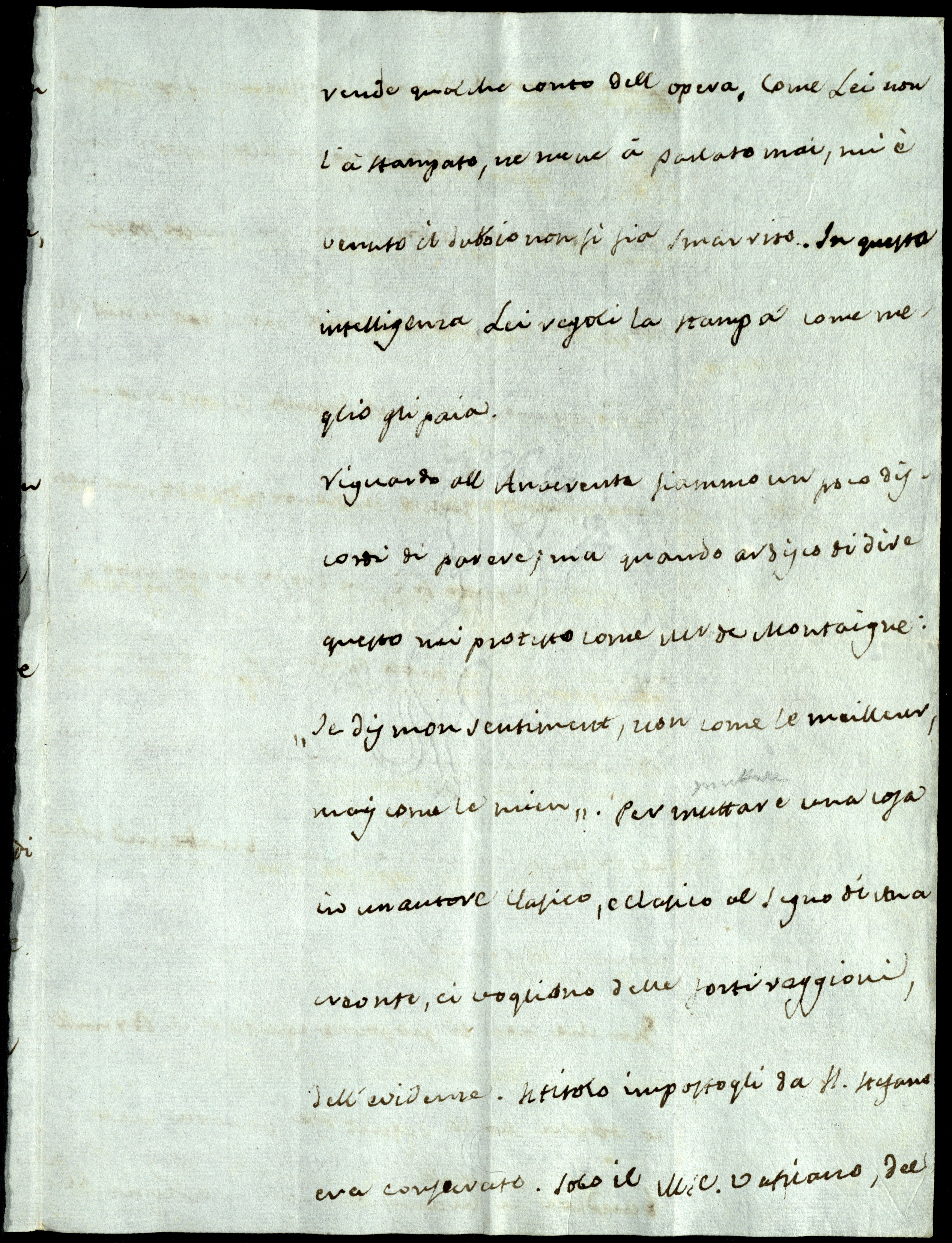 Mi rallegro con Lei della bella machina per stampare senza lasciare trazia della pressione, perché con ciò ha datto Lei la più gran perfezione alla stampa. Resta che Lei persuada a codesti fabricatori di carta di migliorarne la qualità.