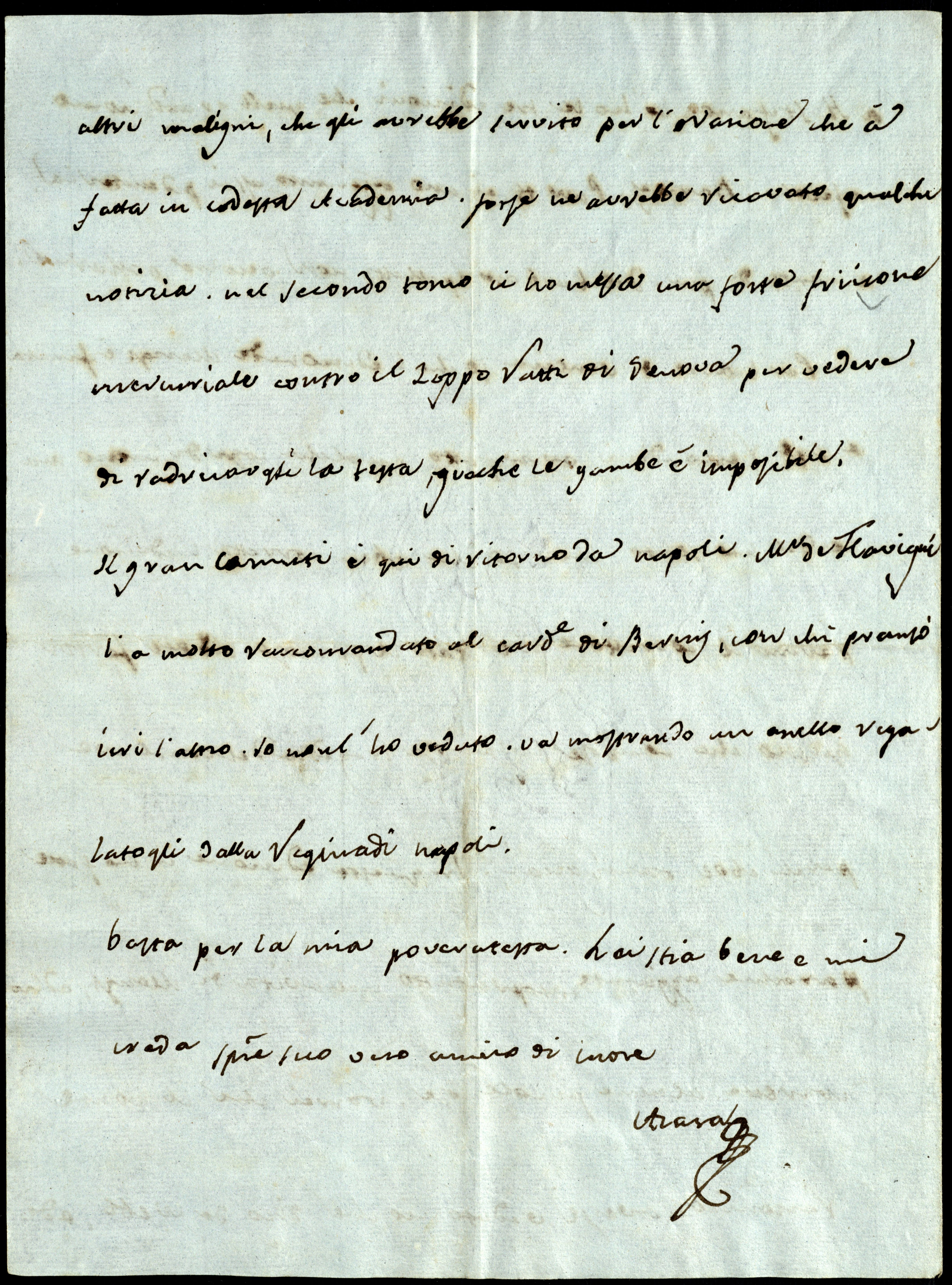 Il gran Camuti è qui di ritorno da Napoli. Monsieur De Flavigni l’ha molto raccomandato al Cardinale di Bernis, con chi pranzò ieri l’altro. Io non l’ho veduto. Va mostrando un anello regalatogli dalla Regina di Napoli.