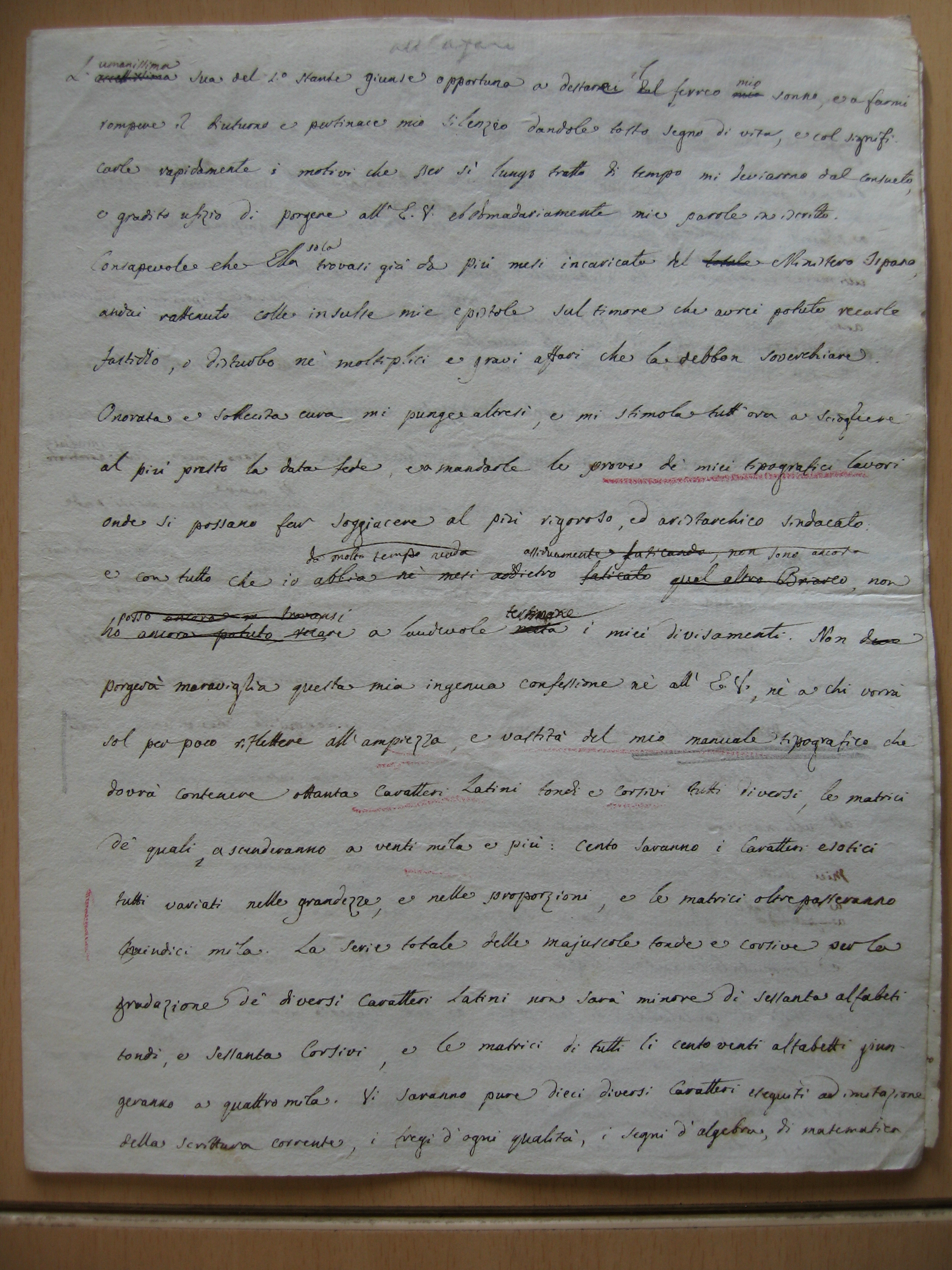 Non porgeràm meraviglia questa mia ingenua confessione né all’Eccellenza Vostra né a chi vorrà sol’ per poco riflettere all’ampiezza e vastità del mio Manuale tipografico, che dovrà contenere ottanta caratteri latini tondi e corsivi tutti diversi, le matrici de’ quali ascenderanno a venti mila e più. Cento saranno i caratteri esotici, tutti variati nelle grandezze e nelle proporzioni, e le matrici oltrepasseranno quindicin mila. La serie totale delle maiuscole tonde e corsive per la gradazione de’ diversi caratteri latini non sarà minore di sessanta alfabeti tondi e sessanta corsivi, e le matrici di tutti li centoventi alfabetti giungeranno a quattromila. Vi saranno pure dieci diversi caratteri eseguiti ad imitazione della scrittura corrente, i fregi d’ogni qualità, i segni d’algebra, di matematica, di medicina, le note musicali gregoriane e figurate, le linee semplici, duplici, tripli, sgraffe, ecc. ecc., ov’ tutten le mostre dio questa inuditap ed incredibil suppelletile dovra[no]q da me prodursi sott’occhior dell’Eccellenza Vostra perché sìs la possano spedire a Madrid, onde si abbiat con certezza e cognizione di causa ad ultimare e definire questa mia faccendau.