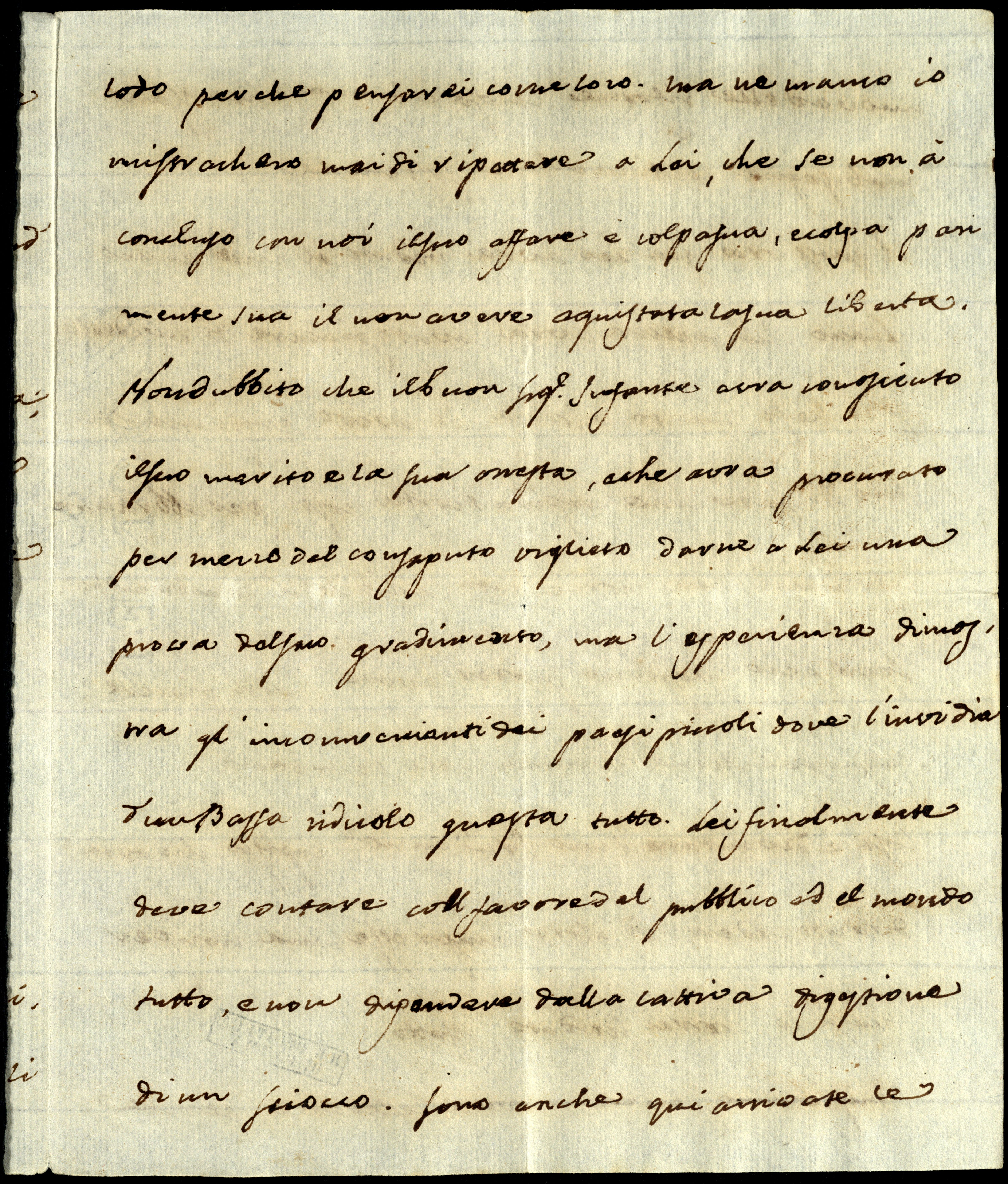 I milanesi non si straccano di fare a Lei delle proposizioni vantaggiose per attrarlo a loro. In questo io li lodo perché pensarei come loro, ma né manco io mi stracherò mai di ripettere a Lei che se non ha concluso con noi il Suo affare è colpa Sua; è colpa parimente Sua il non avere aquistata la Sua libertà. Non dubbito che il buon Signore Infante avrà conosciuto il Suo merito e la Sua onestà e che avrà procurato, per mezzo del consaputo viglieto, darne a Lei una prova del Suo gradimento; ma l’esperienza dimostra gli incomvenienti dei paesi piccoli dove l’invidia d’un Bassa ridicolo guasta tutto. Lei finalmente deve contare coll favore del pubblico e del mondo tutto e non dipendere dalla cattiva digestione di un sciocco.
