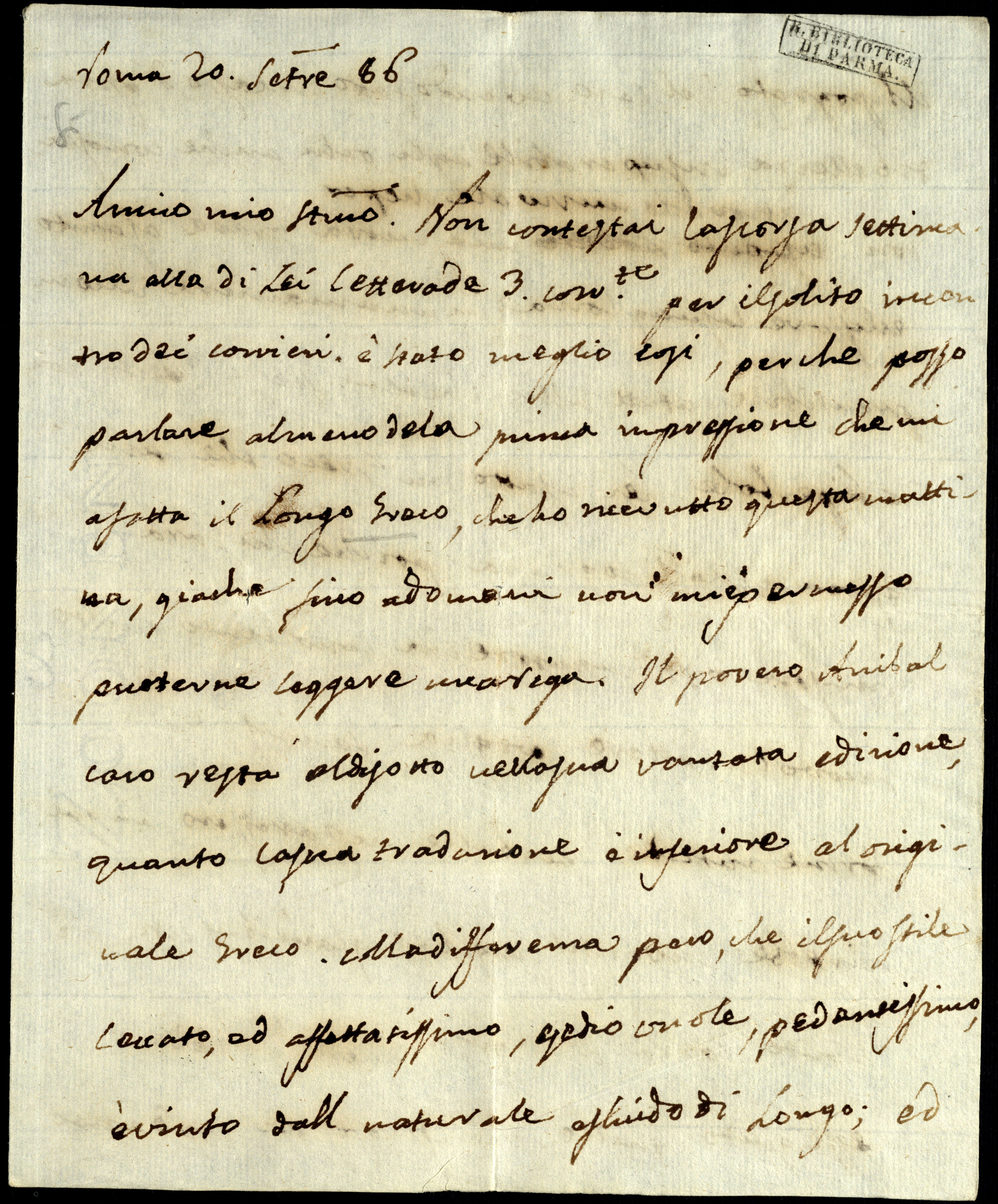 Non contestai la scorsa settimana alla di Lei lettera de 3 corrente per il solito incontro dei corrieri. È stato meglio così, perché posso parlare almeno de[l]la prima impressione che mi ha fatta il Longo greco che ho ricevutto questa mattina, giaché fino a domani non mi è permesso puoterne leggere una riga.