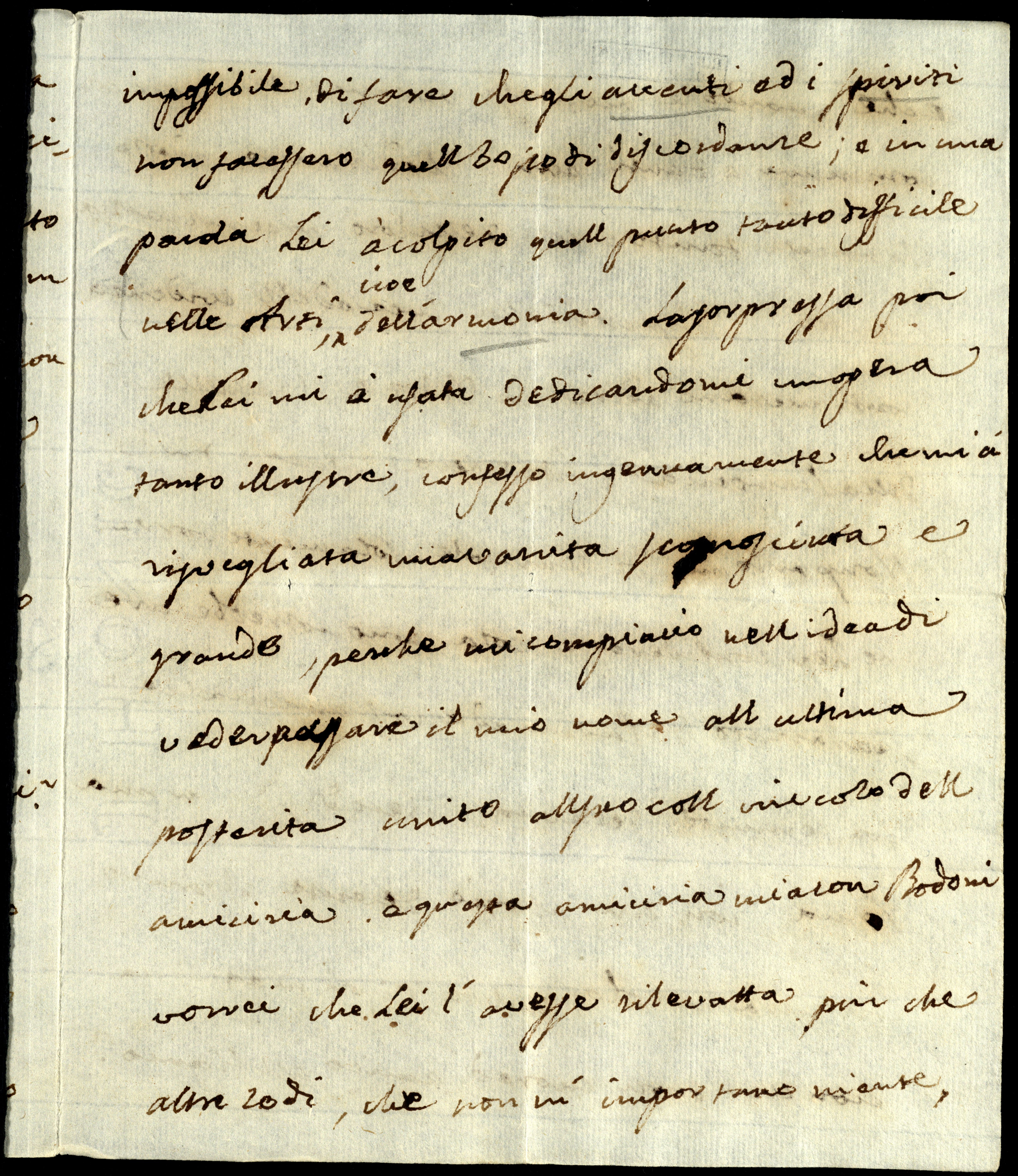 La sorpressa, poi, che Lei mi ha usata dedicandomid un’opera tanto illustre, confesso ingenuamente che mi ha risvegliata una vanità sconosciutae e grande, perché mi compiacio nell’idea di veder passare il mio nome all’ultima posterità unito all Suo coll vincolo dell’amicizia. E questa amicizia mia con Bodoni vorrei che Lei l’avesse rilevatta più che altre lodi che non m’importano niente e che, quando le meritassi veramente, sono cose communi a tanti altri.