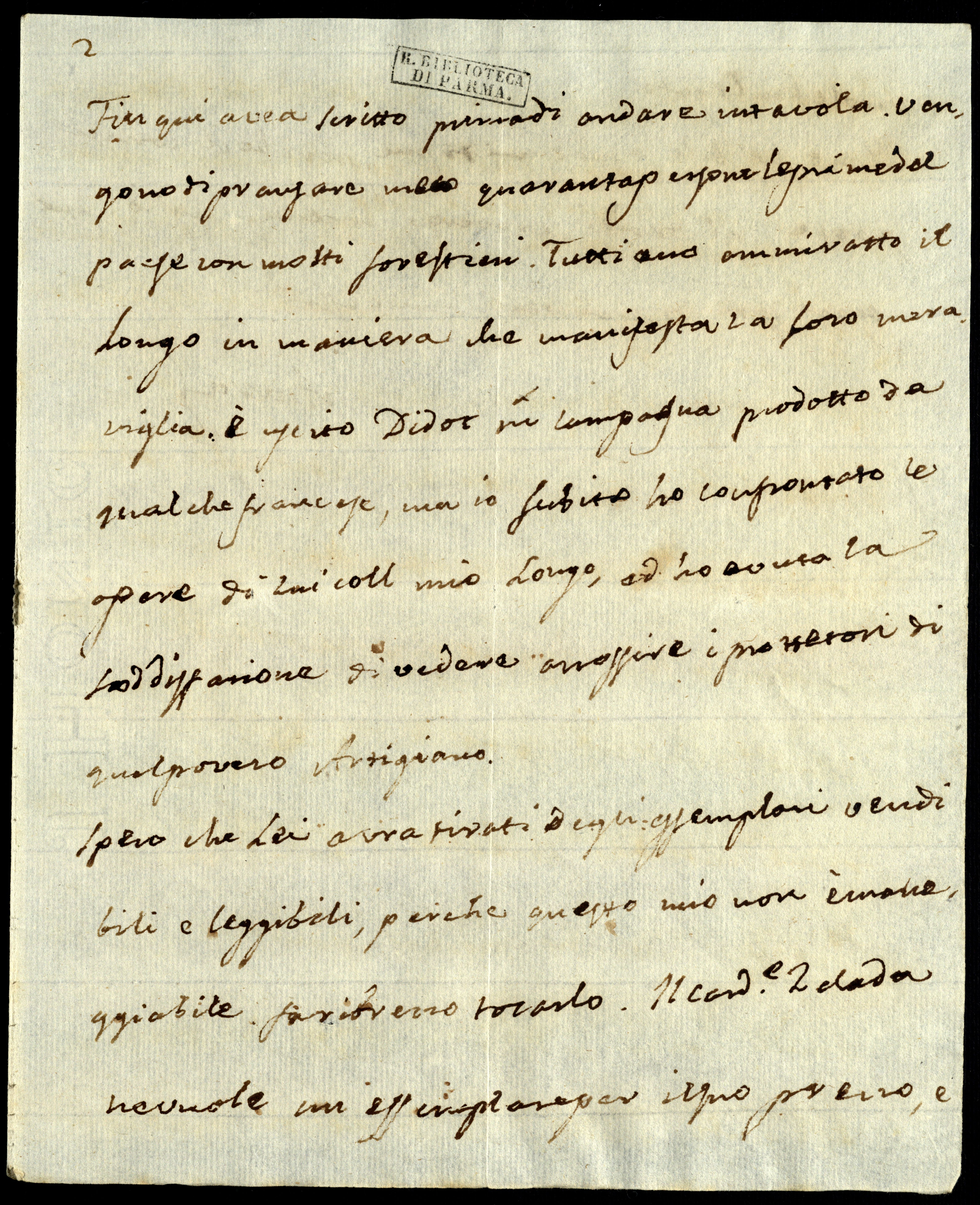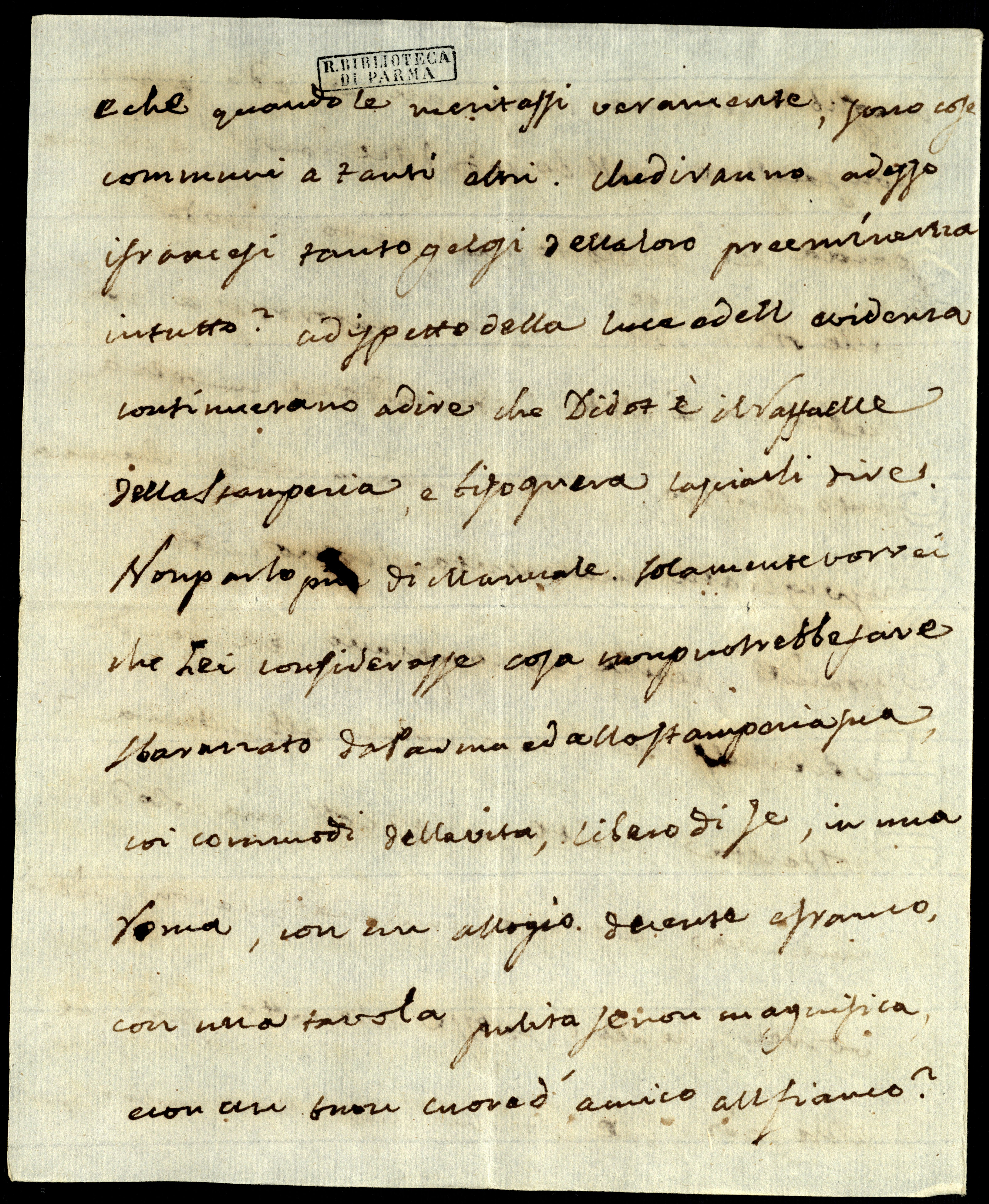 Non parlo più di Manuale. Solamente vorrei che Lei considerasse cosa non puotrebbe fare, sbarazzato da Parma e dalla Stamperia Sua, coi commodi della vita, libero di sé, in una Roma con un allogio decente e franco, con una tavola pulita se non magnifica e con un buon cuore d’amico all fianco?