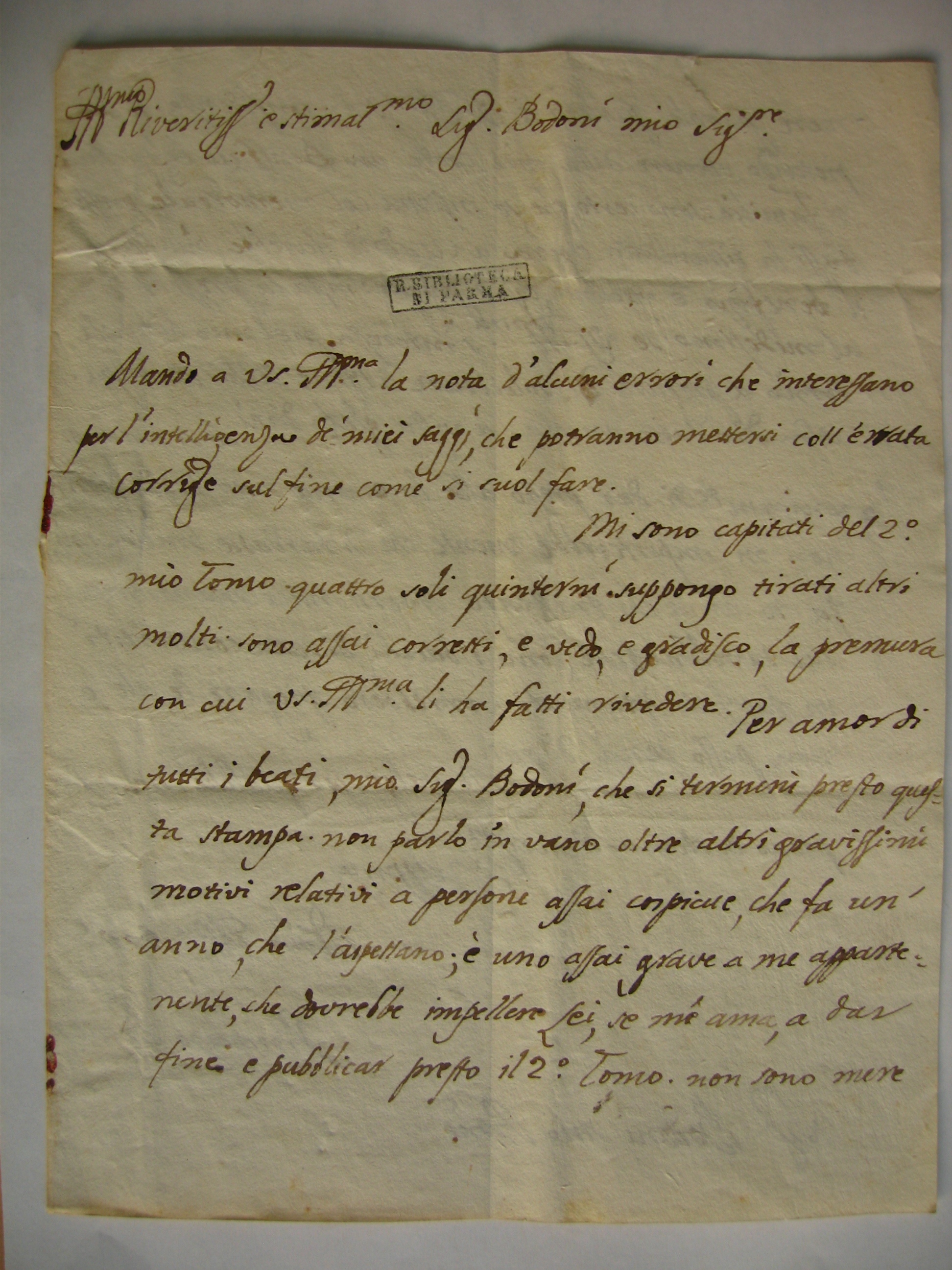 Per amor di tutti i Beati, mio Signor Bodoni, che si termini presto questa stampa. Non parlo in vano: oltre altri gravissimi motivi relativi a persone assai cospicue, che fa un’anno che l’aspettano, è uno assai grave a me appartenente, che dovrebbe impellere Lei, se mia ama, a dar fine e pubblicar presto il 2º. tomo. Non sono mere mere parole. Parlerò a Vostra Signoria Illustrissima in confidenza. Io pretendob ottenere dalla mia corte un benefizio eclesiastico di familia. Sono certo, che, se insieme col memoriale, presentassi la ristampata opera a Madrid farebbe più forza. Il benefizio è vacante, egli è pingue, insta la pressentazione al medesimo. Se Vostra Signoria Illustrissima s’interessa nel mio bene, La torno a pregare di solecitare il fine della stampa. Non dico tutto ancora; a vista glelo direi.
