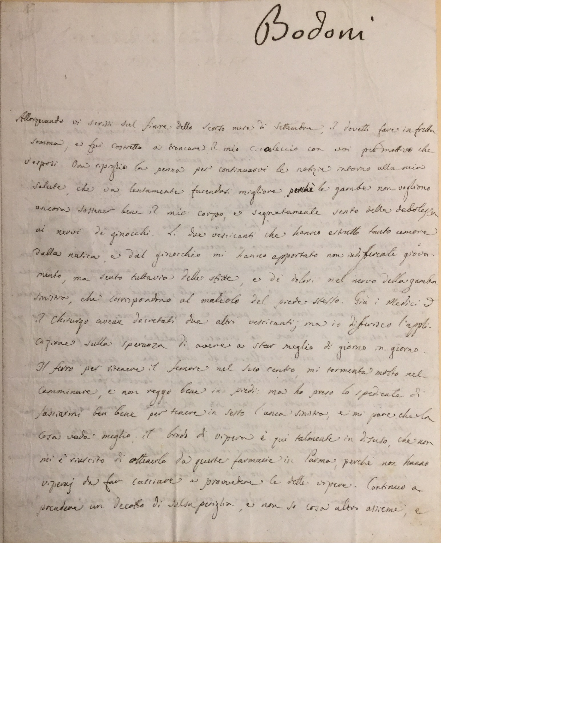 Bodoni fa un resoconto dettagliato della sua malattia al suo amico il dottore Vincenzo Malacarne.