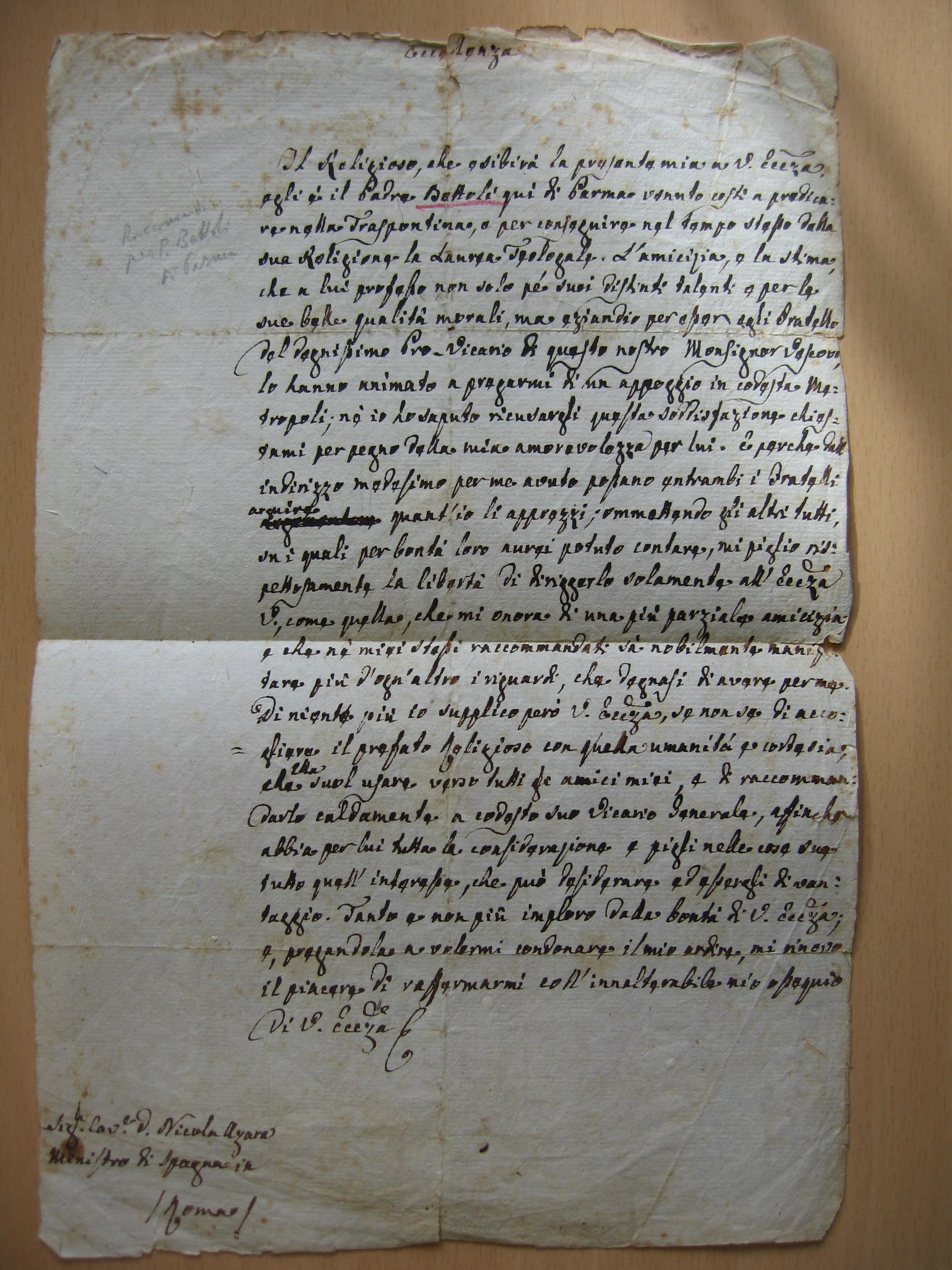 Il religioso che esibirà la presente mia a Vostra Eccellenza, egli è il Padre Battoli, qui di Parma, venuto costì a predicare nella traspontina e per conseguire nel tempo stesso dalla sua religione la laurea teologale. L'amicizia e la stima che a lui professo, non solo pe' suoi distinti talenti o per le sue belle qualità morali, ma, eziandio per esser egli fratello del degnissimo Provicario di questo nostro Monsignor Vescovo, lo hanno animato a pregarmi di un appoggio in codesta metropoli; né io ho saputo ricusargli questa soddisfazione chiestami per pegno della mia amorevolezza per lui. E perché dall'indirizzo medesimo per me avuto possano entrambi i fratelli arguirea quant'io li apprezzi, ommettendo gli altri tutti sui quali per bontà loro avrei potuto contare, mi piglio rispettosamente la libertà di diriggerlo solamente all'Eccellenza Vostra, come quella che mi onora di una più parziale amicizia e che ne' miei stessi raccommandati sa nobilmente manifestare più d'ogn’altro i riguardi che degnasi di avere per me.
