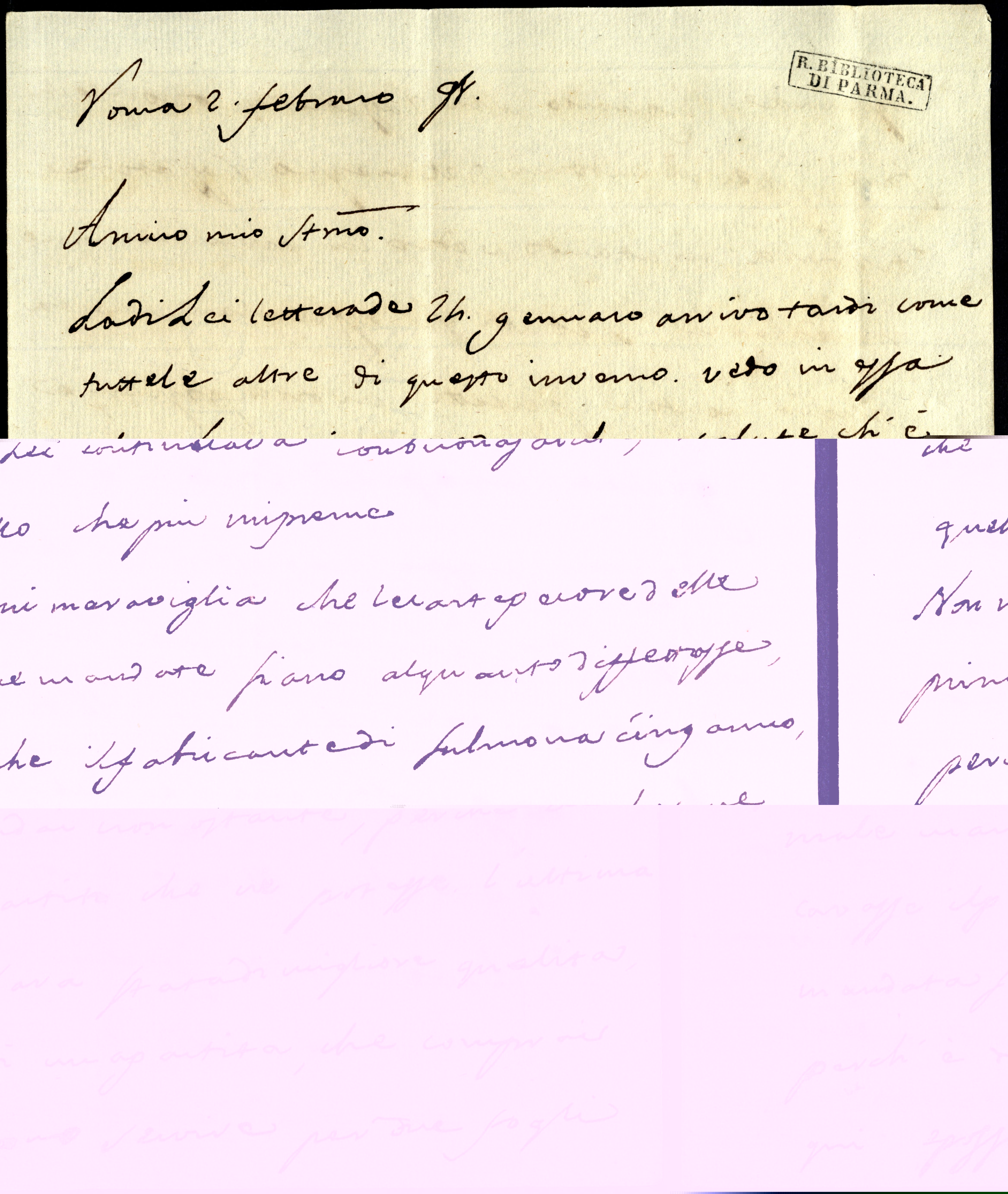 Credo che potrò mandare le prove della settimana corrette, benché non ho vedutti i miei abati in questi giorni per essere stato quasi sempre a pranso [sic] fuori di casa, a motivo del Carnovalle e del mio cuggino Cuber, che alloggia meco.
