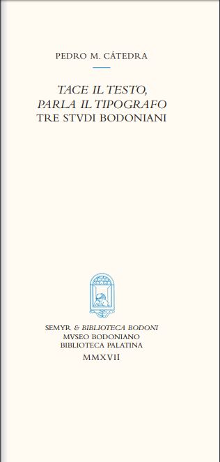 La Biblioteca Bodoni y el Seminario de Estudios Medievales y Renacentistas (SEMYR), en colaboración con el Museo Bodoniano y la Biblioteca Palatina de Parma, han publicado un nuevo volumen bodoniano que reúne tres estudios firmados por el director de la BB, Pedro M. Cátedra: Tace il testo, parla il tipografo. Tre studi bodoniani (Salamanca & Parma, 2017).